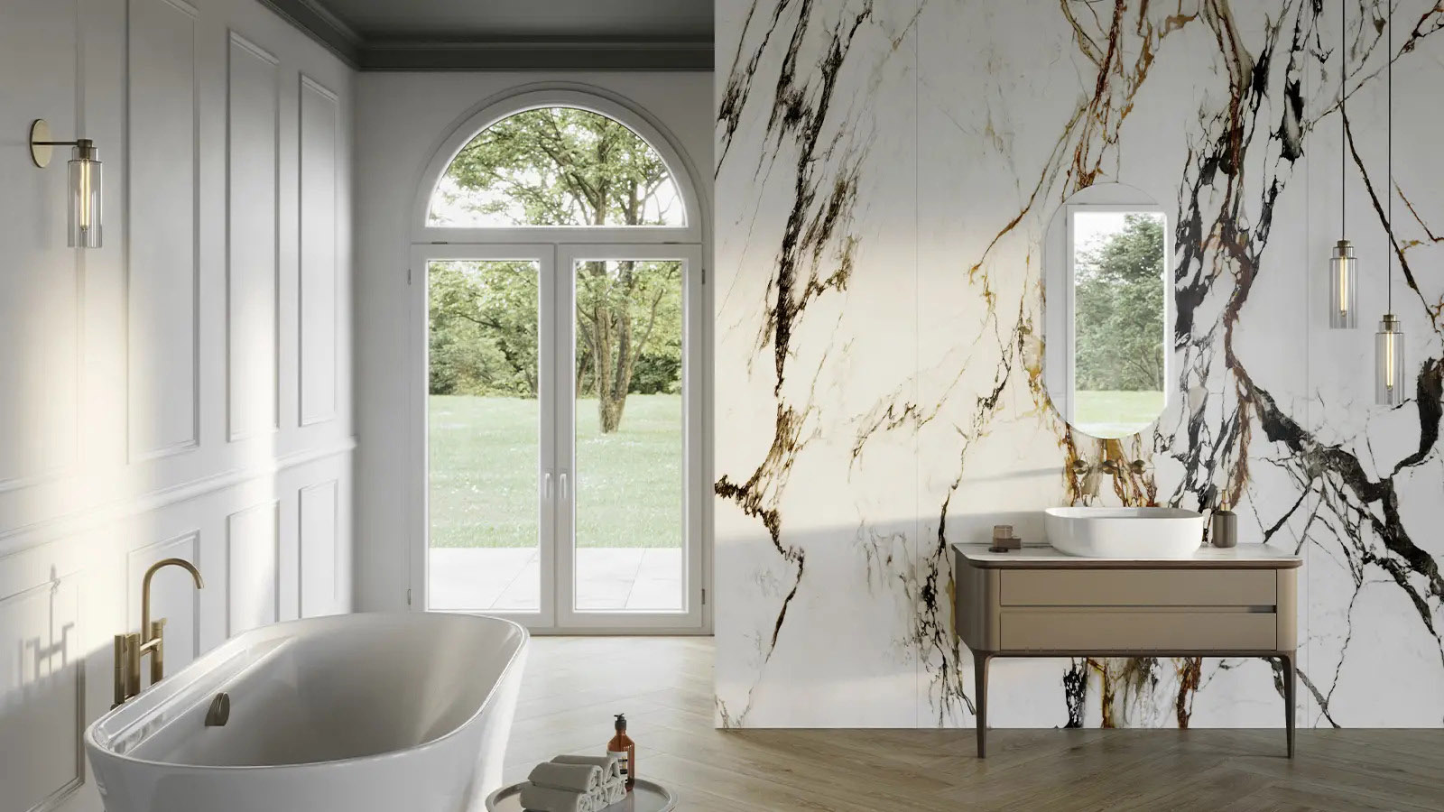 Nội thất phòng tắm tối giản và tường đá cẩm thạch trắng vân nâu xám tự nhiên là gợi ý hoàn hảo cho không gian phòng tắm thư giãn cho người dùng. Gạch ốp vân đá cẩm thạch sẽ giúp cân bằng thẩm mỹ và mang hơi thở thiên nhiên thư thái đến không gian.